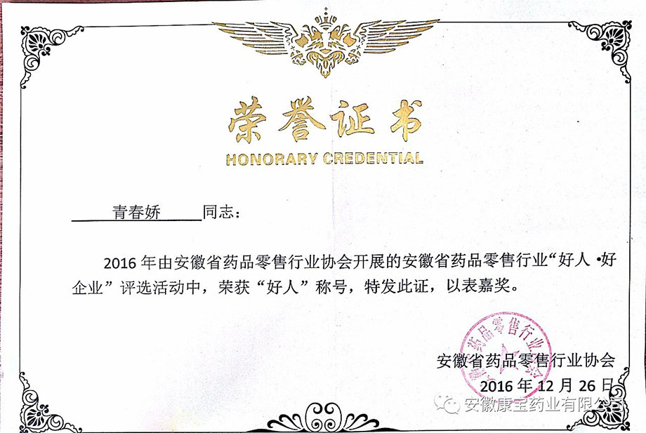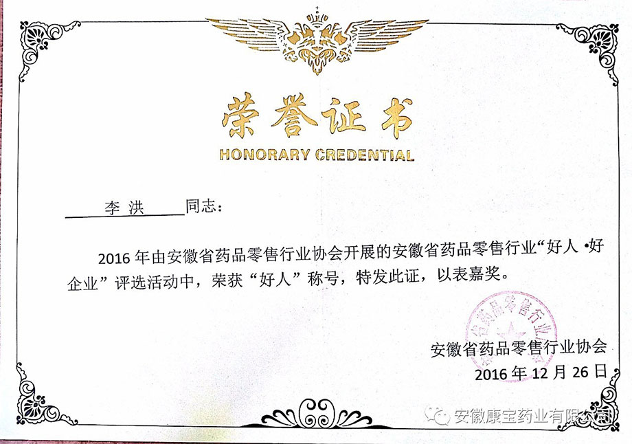 歲末好事不斷,康寶獲獎(jiǎng)連連。12月26日,由省藥品零售行業(yè)協(xié)會(huì)主辦的安徽省藥品零售企業(yè)“好人 好企業(yè)”頒獎(jiǎng)典禮在省城合肥隆重舉行?;茨蠔|方醫(yī)院集團(tuán)全資子公司康寶藥業(yè)通過逐級(jí)推薦、層層考核、公開評(píng)審等程序,最終被評(píng)為“好企業(yè)”稱號(hào),康寶藥業(yè)員工青春嬌、李洪被評(píng)為“好人”稱號(hào)。