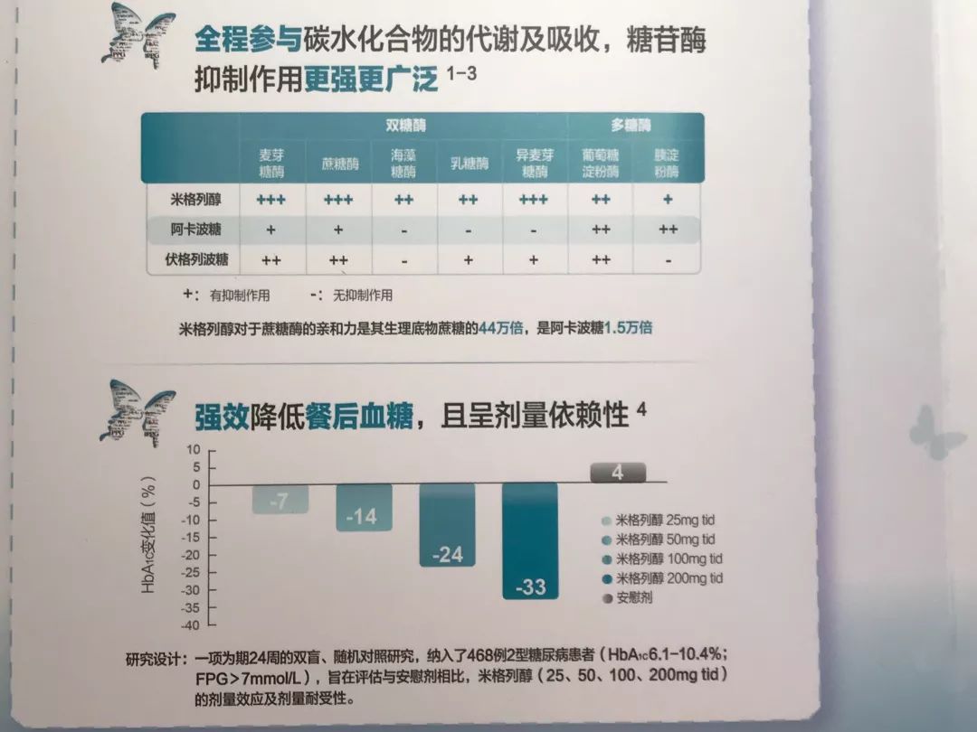 而米格列醇片作為第三代α-糖苷酶抑制劑,在國內臨床使用過程中經實踐證明,它的藥效明顯優于阿卡波糖和伏格列波糖,并且較以上兩種產品減少了胃腸反應,也大大降低了口服不適感,尤其在用藥細節方面也貼切的考慮到了老人患者由于年齡大,經常忘記吃藥這一現象,米格列醇片不僅可以餐前服用,在餐后三十分鐘內口服依然可以達到血藥濃度,保持藥效,深受廣大中老年患者的好評!